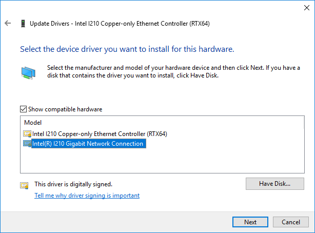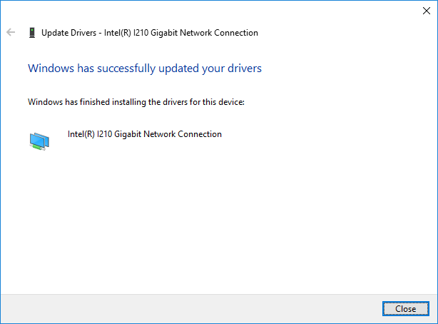 - The Windows driver installs for the network card. Click Close after the installation is completed. The network card has been returned to Windows.
