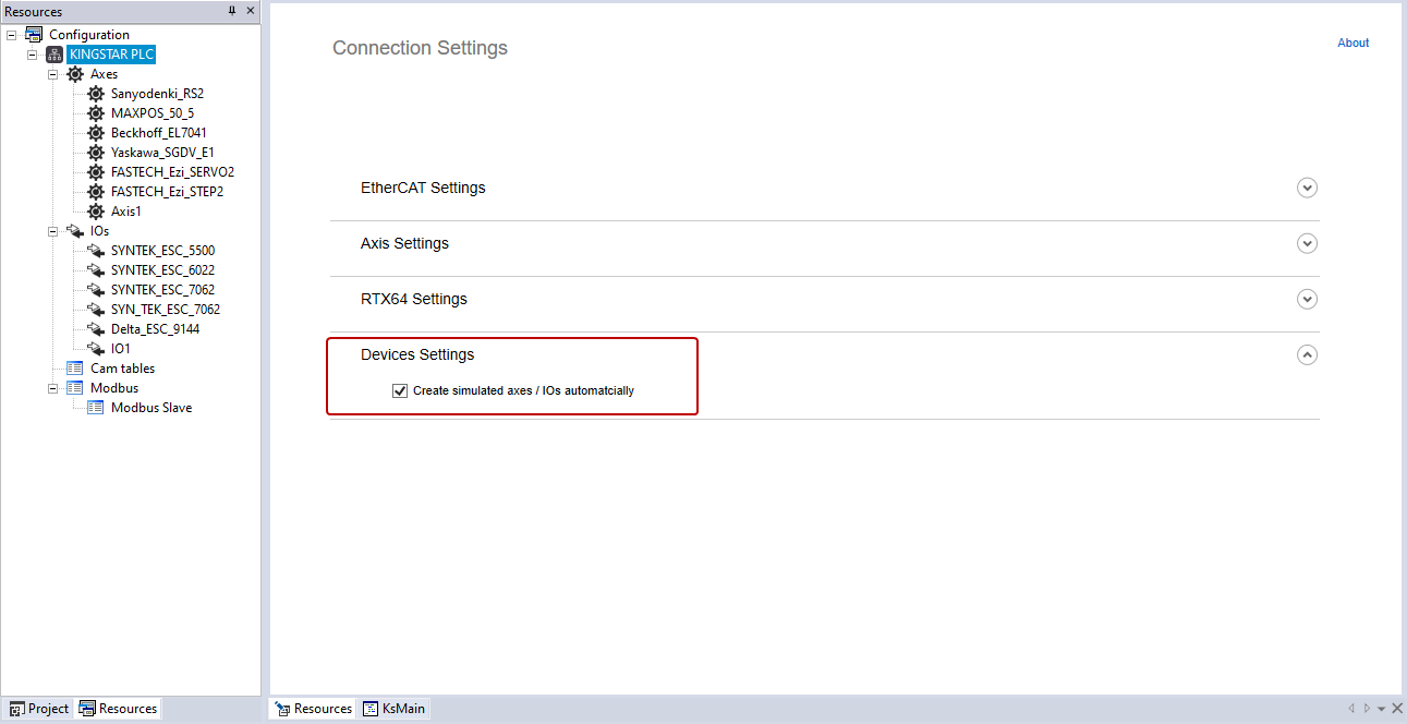 - In the Resources panel in the middle, in Connection Settings, click Devices Settings and make sure the Create simulated axes / IOs automatically check box is selected.