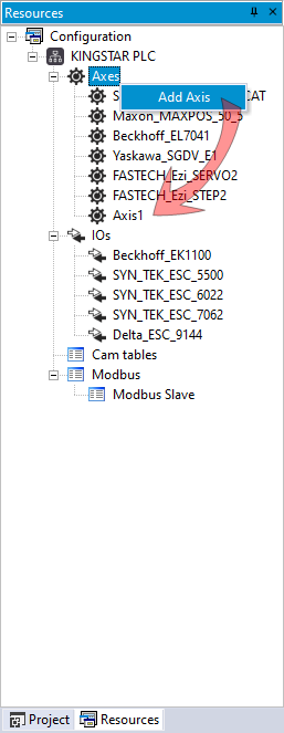 - In this guide, we want to create three simulated axes and two simulated I/Os. To do this, first we add a simulated axis. In the Resources panel to the left, right-click Axes and click Add Axis to add a simulated axis.