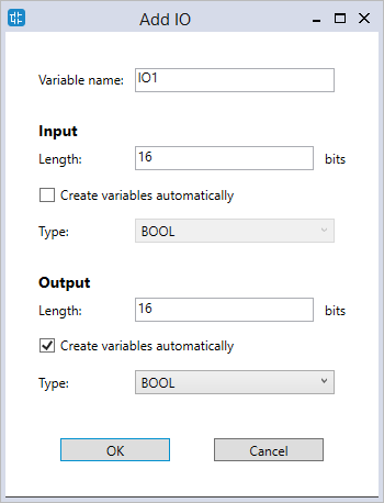 - Right-click IOs and click Add IO to add a simulated I/O module. When you add an I/O module, you can edit its name, input and output length, and data type in the Add IO dialog box.