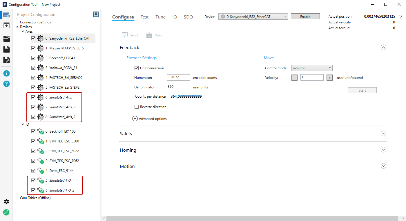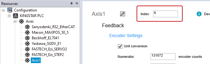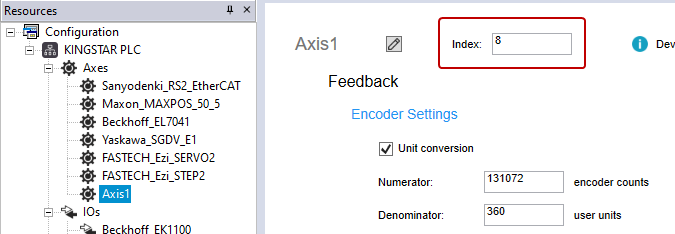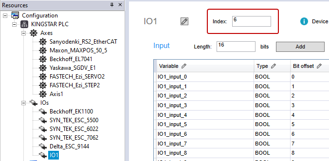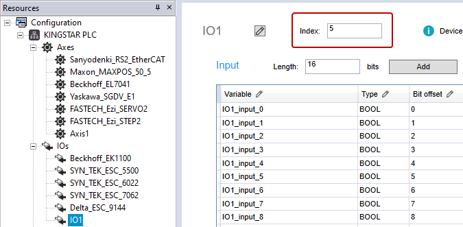 - You now have one simulated axis and I/O module. The index of the simulated axis and I/O module is six and five, respectively. Change the index of the simulated axis to eight, and I/O module to six.
