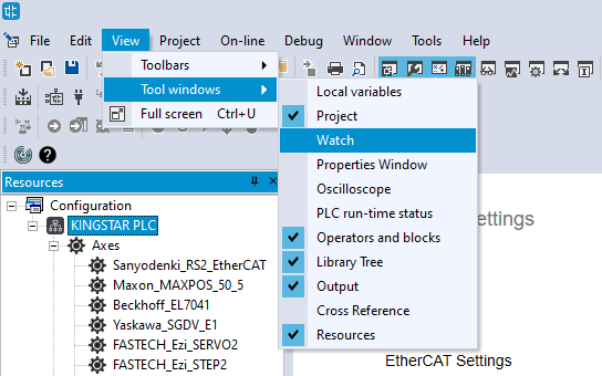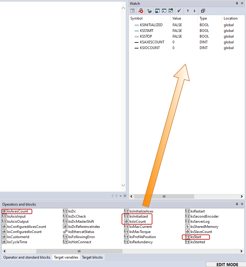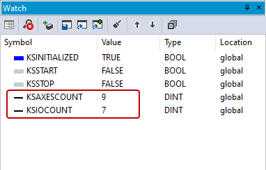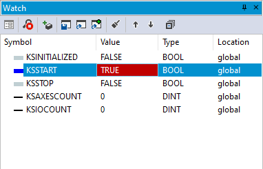 - Under KINGSTAR_Subsystem, find and drag ksInitialized, ksStart, ksStop, ksAxesCount, ksIoCount to the Watch panel.