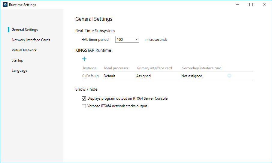 To set the HAL timer period, go to KINGSTAR Runtime Settings > General Settings> Real-Time Subsystem > HAL timer period:
