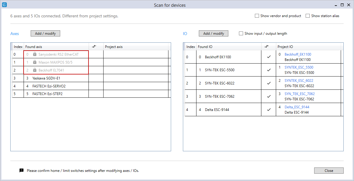 In LogicLab, click Scanbus to scan the connected hardware. In the Scan for devices dialog box, the first three axes are locked. They won't be added to the Axes list in the Resources panel to the left.