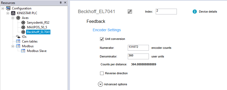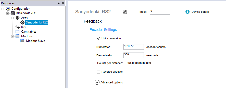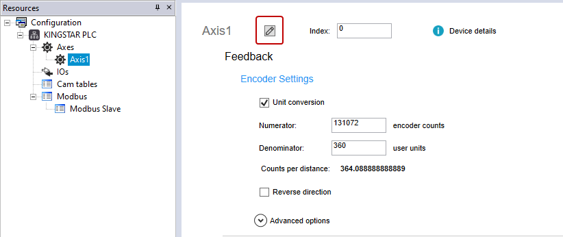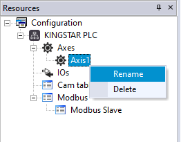 - In the Resources panel in the middle, change the settings for the axis. You need to know what device this axis will connect to and then configure the settings, so the device can work properly.