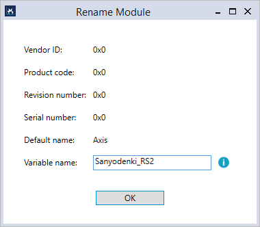 - In the Rename Module dialog box, in the Variable name box, enter the name for the device. We suggest you use a meaningful name so you can tell what device this axis controls. When you finish editing, click OK.