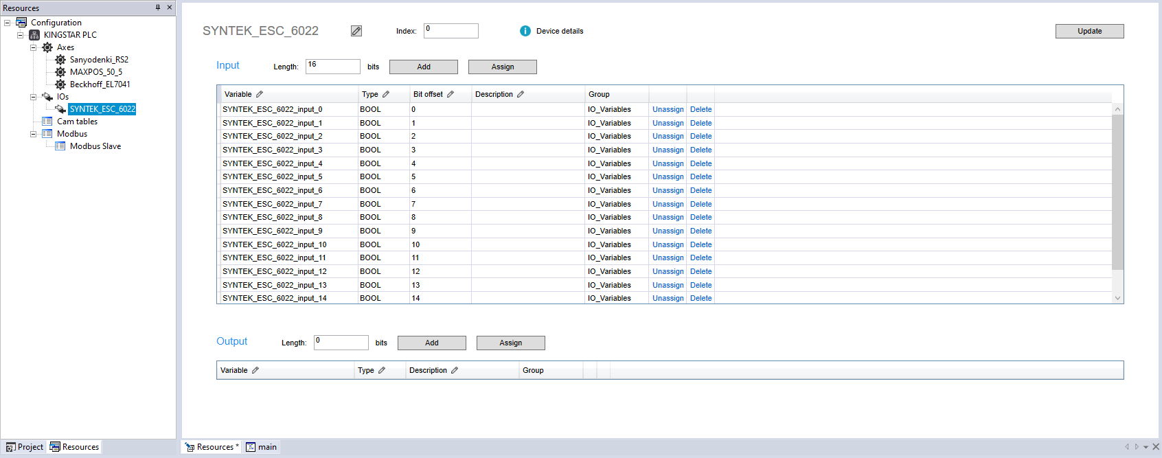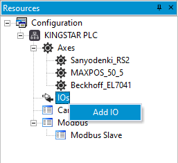 - In the Resources panel to the left, right-click IOs and click Add IO.