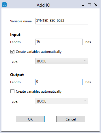 - In the Add IO dialog box, in the Variable name box, enter a meaningful name for your I/O module. The Input and Output settings should match your I/O module's specification. When you finish editing, click OK.