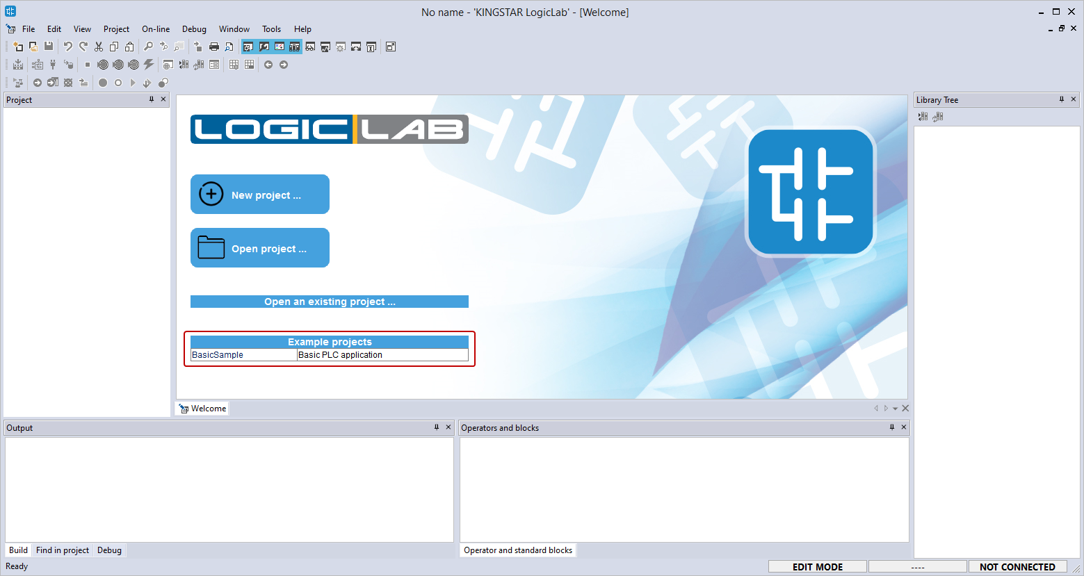 After you start LogicLab, you'll find that the BasicSample PLC project is listed in the Welcome pane. This is a sample project created using function blocks that demonstrate the basic control of an axis, such as power, alarm reset, movement, and state check. If you want to use a sample program to create your own PLC program, this one can be a good start. The sample program is located at C:\Program Files (x86)\KINGSTAR LogicLab\SampleProjects\BasicSample