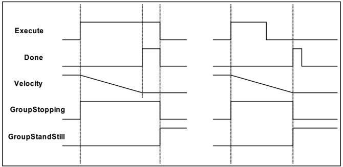 | Commands a controlled motion stop and transfers the axis group to the state GroupStopping. It aborts any ongoing function block execution. While the axis group is in the GroupStopping state, no other function block can perform any motion on the same axis group. After the axis group has reached velocity zero, the Done output is set to TRUE immediately. The axis group remains in the GroupStopping state as long as Execute is TRUE or velocity zero is not yet reached. As soon as Done is TRUE and Execute is FALSE, the axis group goes to the GroupStandBy state. The command can only be aborted by MC_GroupDisable. | |||