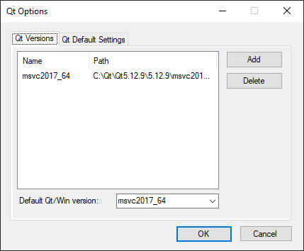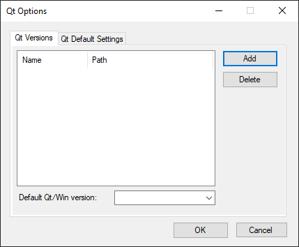 - In the Qt Options dialog box, on the Qt Versions tab, click Add.