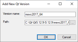 - In the Add New Qt Version dialog box, click ... to browse to the MSVC 2017 64-bit component we downloaded. The default path of this component is at C:\Qt\Qt5.12.9\5.12.9\msvc2017_64. After you choose the path, click OK.