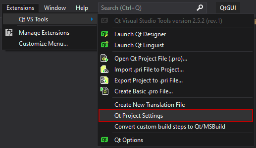 - On the Extensions menu, click Qt VS Tools > Qt Project Settings.