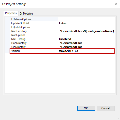 - In the Qt Project Settings dialog box, on the Properties tab, click the Version list and select msvc2017_64.