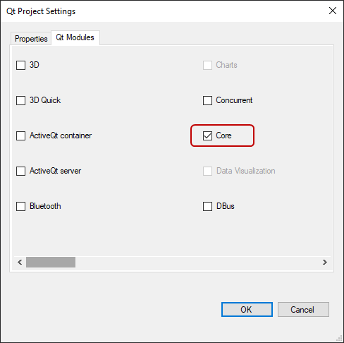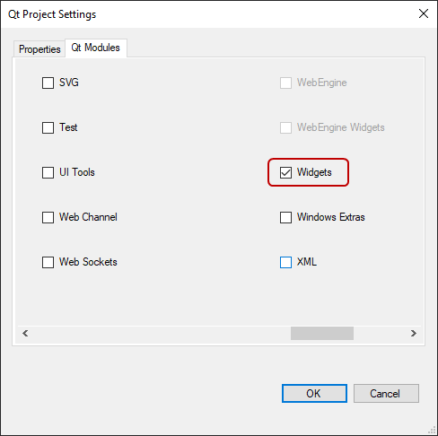 - On the Qt Modules tab, select the Core, GUI, and Widgets check boxes and click OK.