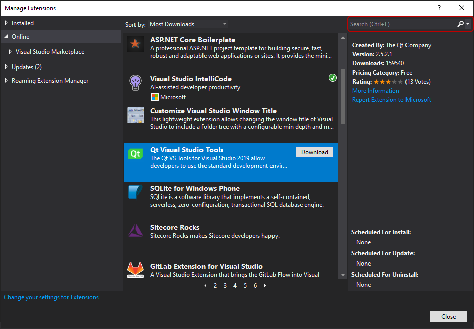 - In the middle pane, find Qt Visual Studio Tools and click Download. To find it quickly, in the search box, enter the word Qt.