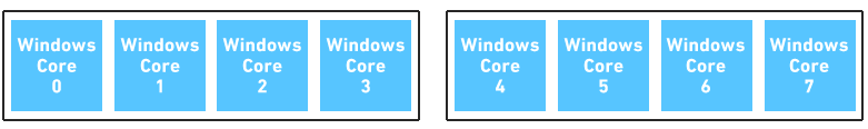RTX64 statically partitions cores on a system so there are cores dedicated to Windows and cores dedicated to RTSS. Up to 64 core systems are supported by RTX64. For example, on a system with 24 cores if the RTX64 subsystem is configured to use 20 cores, Windows would be able to use cores 0, 1, 2, 3, and RTX64 would use the remaining cores 4 through 23.
