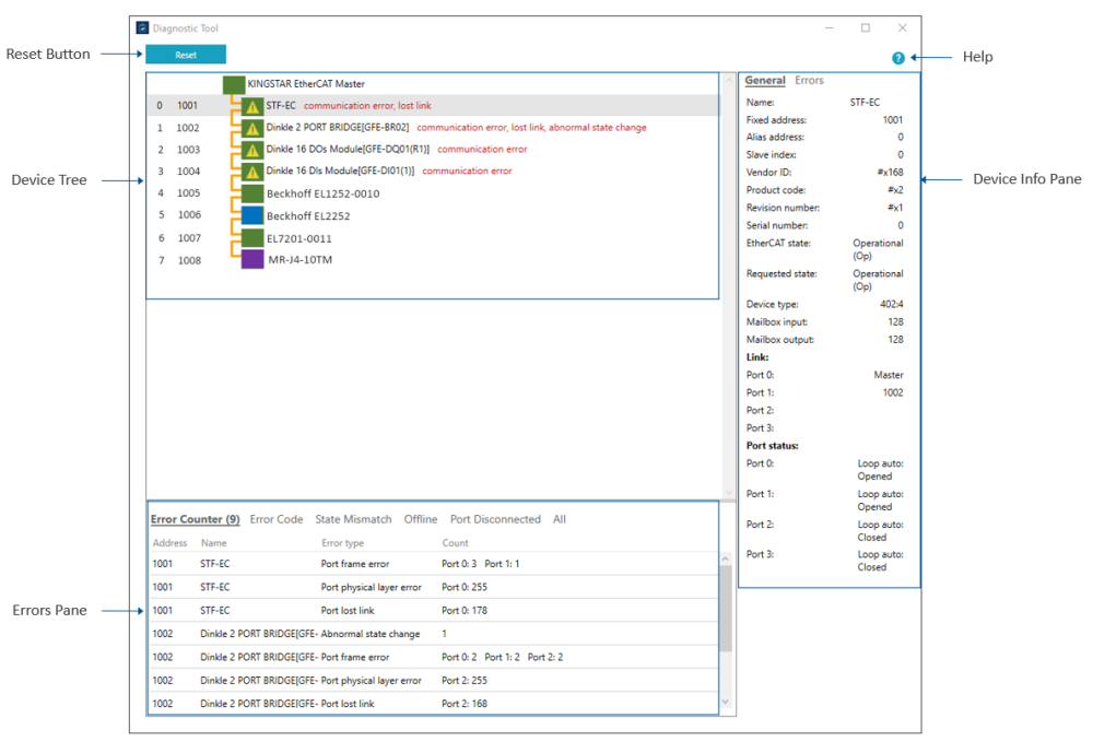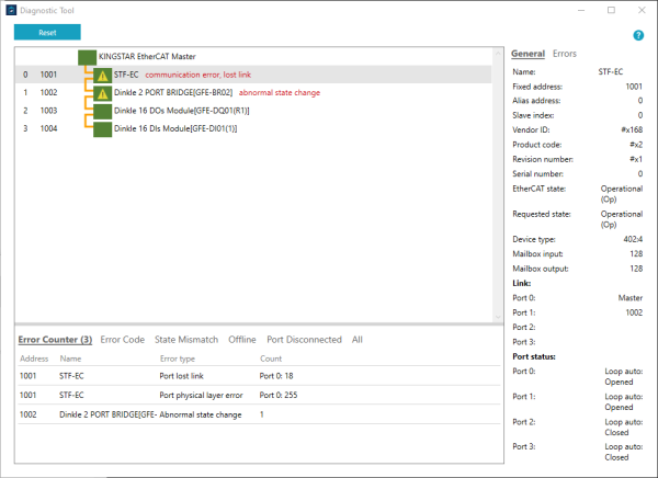 - The Diagnostic Tool window should be displayed. You can start monitoring the connectivity between the master and slave devices on the EtherCAT network. You can click the Reset button multiple times to identify which errors persistently occur.