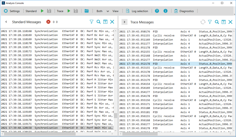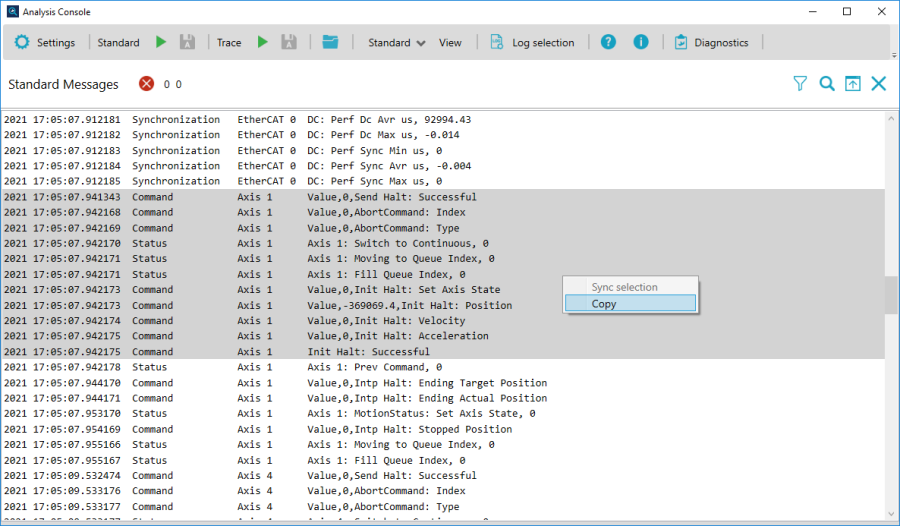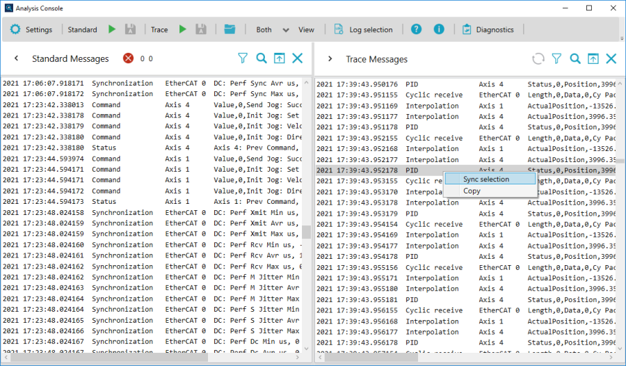 Use Synchronization to synchronize the entries displayed in the Standard and Trace view. This allows you to see what is recorded around a particular time stamp. Both Standard and Trace can use this feature.