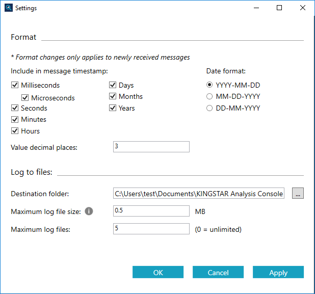 The Settings page provides options that determines how the log is presented in Analysis Console. When you change one of these settings, optionally click Apply and then click OK. All changes are preserved after you exit Analysis Console.