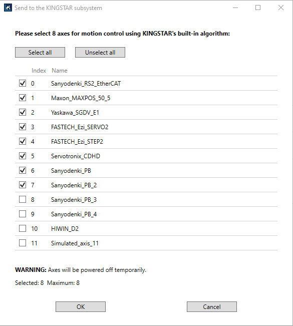Sets a number of devices you want to use. You can leave them as zero if you have real devices to connect. If there is no real devices, you must specify a value to the following boxes, so your computer can have simulated devices to use. Required axes: sets a number of axes to be created on the EtherCAT network. If the required number is greater than the number of the real axes, the system will create simulated ones to meet the requirement. Required IOs: sets a number of I/O modules to be created on the EtherCAT network. If the required number is greater than the number of the real I/O modules, the system will create simulated ones to meet the requirement. Select axes to be used with KINGSTAR control modesThe total number of axes supported by KINGSTAR control modes depends on your license. The total number is the sum of your real and simulated axes. For example, you have purchased the Axis Level 1 package, which supports eight axes. You can have five real axes and three simulated ones, or four real four simulated. These eight axes can be controlled by KINGSTAR control modes. The axes other than these eight are controlled by the manual mode (modeManual), in which you have to use your own motion functions to move your axes. When the value in the Required axes exceeds the number your license supports, Configuration Tool asks you to select the axes you want to use with KINGSTAR control modes. In the following example the license supports eight axes, so we can select eight axes at most. After selecting the axes, click OK to connect.