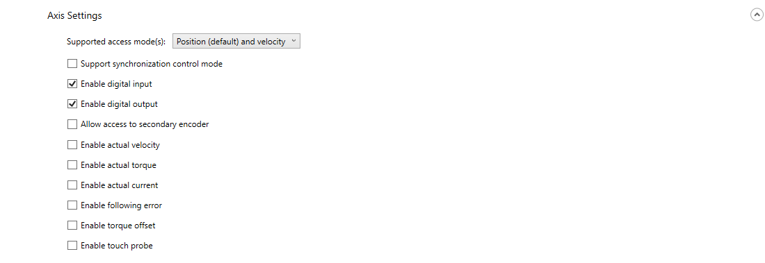 Support synchronization control mode: enables the Modes of Operation and Modes of Operation Display objects. It changes the control mode through PDO instead of SDO, so the control mode can be changed faster (usually in 3-5 cycles). Not all servo drives support this feature. Enable digital input: enables access to the digital inputs for all axes. Not all axes have digital inputs. Enable digital output: enables access to the digital outputs for all axes. Not all axes have digital outputs. Allow access to secondary encoder: enables the access to the internal position of an axis. Enable actual velocity: adds the actual velocity variable to PDO. Enable actual torque: adds the actual torque variable to PDO. Enable actual current: adds the actual current variable to PDO. Enable following error: adds the Following Error variable to PDO. Enable torque offset: adds the torque offset variable to PDO. Enable touch probe: adds the TouchProbeControl and TouchProbeStatus variables to PDO. |