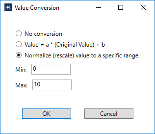 Normalize (rescale) value to a specific range: gives a range to control your machine. For example, you want to control the voltage range between 0V – 10V, so the Min and Max are like this: