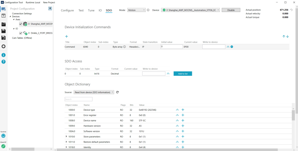 - Read from device (SDO information): select this option to retrieve the object dictionary directly from the EtherCAT device. This function is supported only when the EtherCAT device is in the PreOp, SafeOp, or Op state. The Refresh button is available only in these states and allows you to update the retrieved object dictionary.
