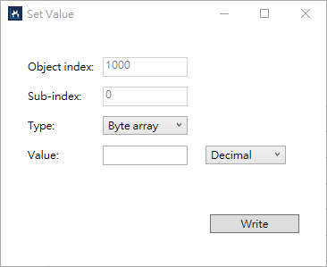 Write to device: the value to be written into the object or its entry. After you enter the value, press the Write icon () to write.