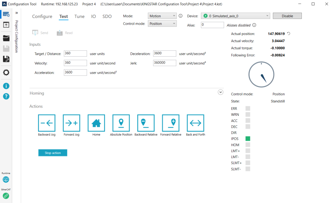 To enter this page, click on an axis device on the Project Configuration pane and then click the Test tab on the Settings pane. To start testing the selected axis, click the Enable button on the upper-right window. You can also select an axis from the Device drop-down list and then Enable it.