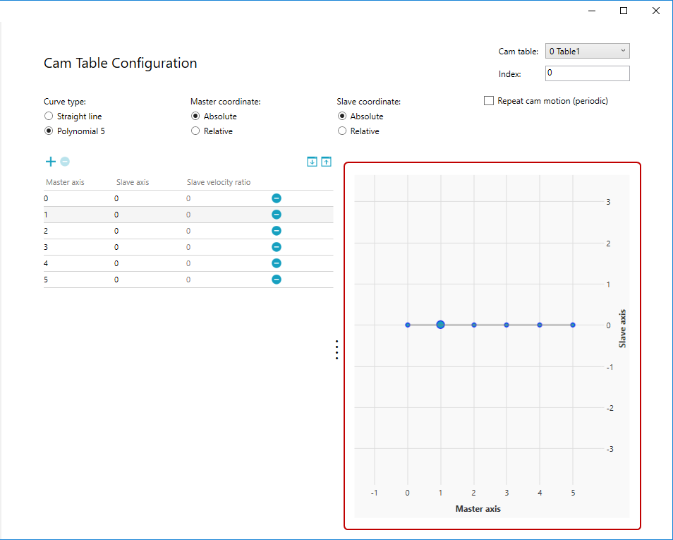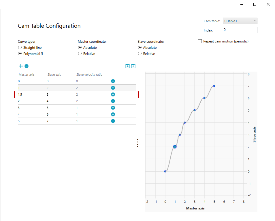 - In the position table, double-click one of the Master axis or Slave axis cell and change the value.