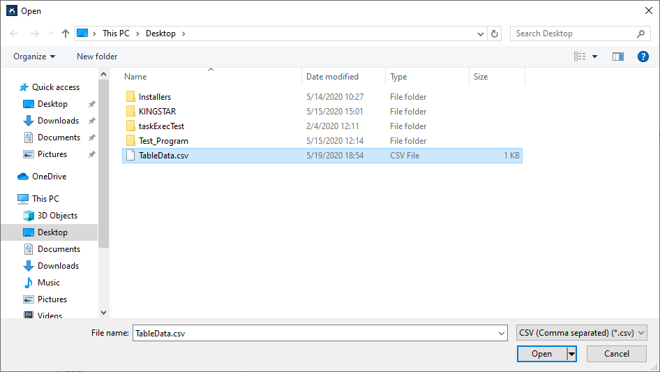 ). - In the Open dialog box, select the .csv file that contains the positions of the master and slave axes, and then click Open.