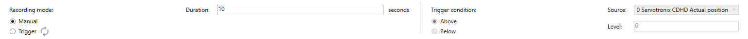 Duration: the recording length. The maximum is 20 seconds, the minimum is 1 second. When cycle time is equal to or less than 125 microseconds, the maximum is 60 seconds. When cycle time is greater than 125 microseconds, the maximum is 120 seconds.