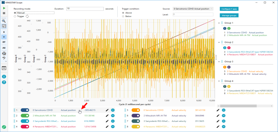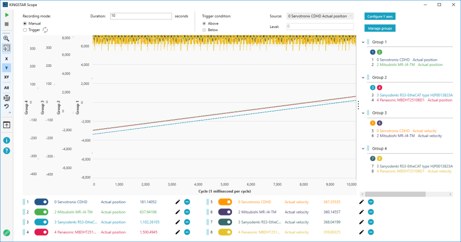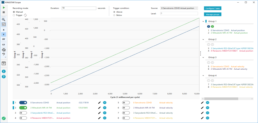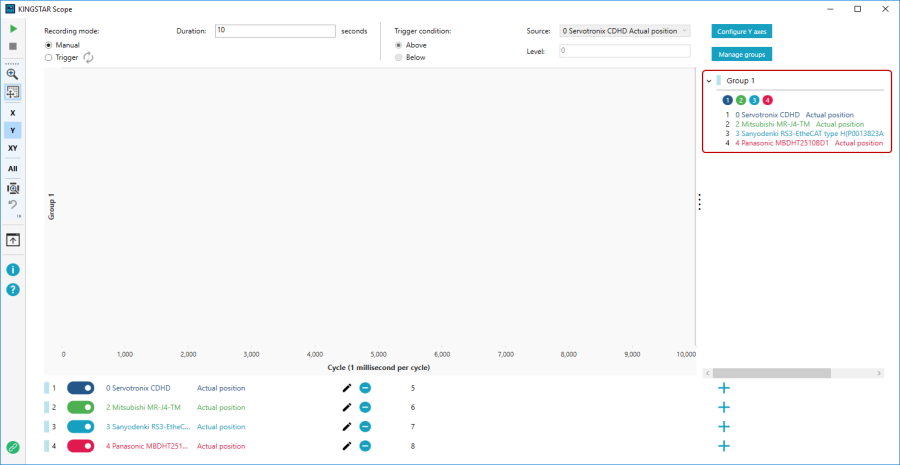 to display all traces in the graph. For more information about how to record, see Record the variables. - In Channel list, click a grouped channel. We want to compare the channels in Group 1, so we click a channel in Group 1.