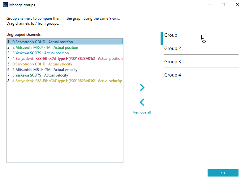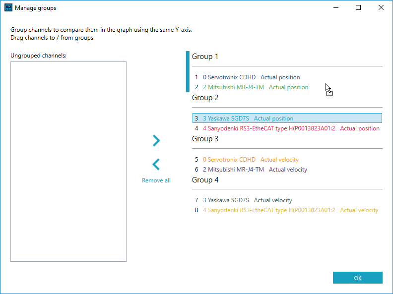 - You can move a channel to a different group by dragging it between groups. After you group the channels, click OK.