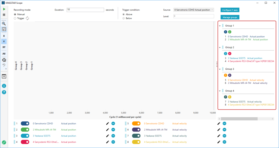 - The Status bar of Group 1 lights up. Zoom target becomes G1. Turn off other channels, so it's easier to compare G1's results. The Y-axis of Group 1 is zoomed when you scroll the mouse wheel.