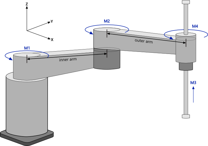 下图展示了 SCARA 的结构,它使用的是机床坐标系统 (MCS)。