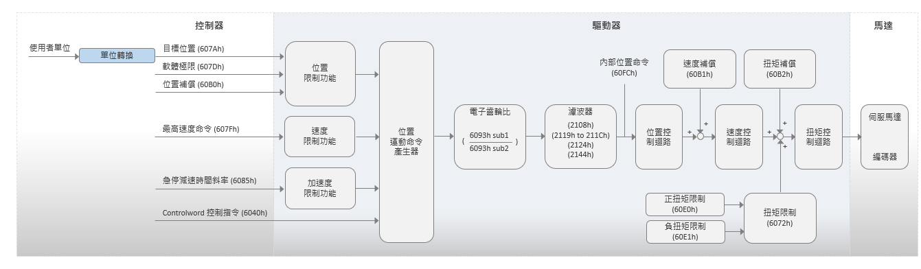以下示意图为驱动器在直接位置 (Direct Position) 模式下以周期同步位置模式 (CSP) 运行的局部架构图,由左而右分为三个区域,分别为控制器、驱动器及马达。当控制器下达指令给驱动器后,驱动器即负责运动规划并控制马达。KINGSTAR 单位转换功能仅发生在控制器区域,仅对于控制器下达的指令本身有效,不会影响驱动器内部如电子齿轮比的设定,电子齿轮比可透过 SDO 进行变更。