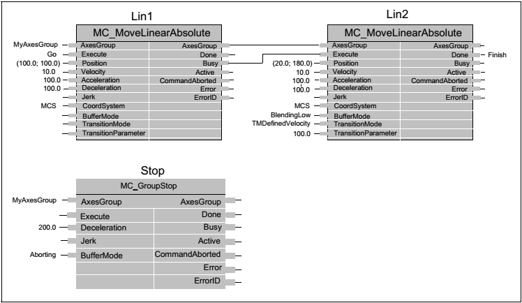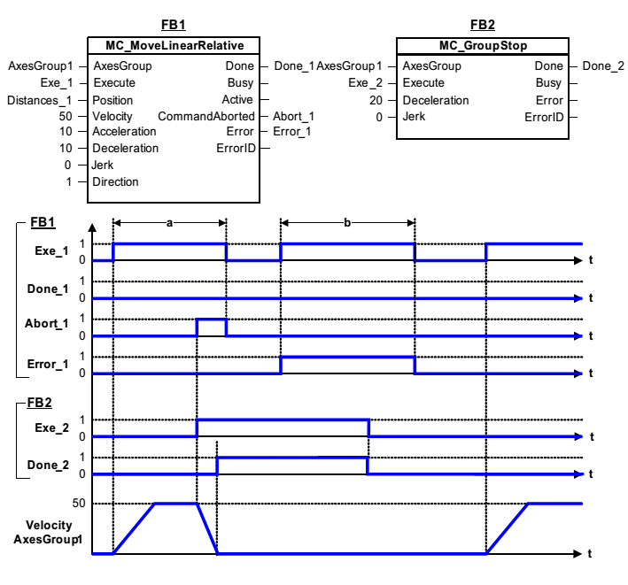 MC_GroupStop 与两个 MC_MoveLinearAbsolute 的组合范例