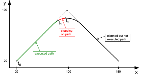 以下范例说明 MC_GroupStop 与两个 MC_MoveLinearAbsolute 的组合之行为,其以定义的连续路径速度融合: