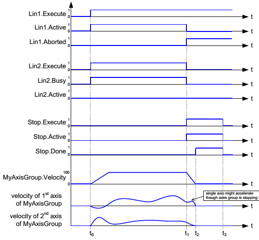 t1) 工具中心点开始在混合轮廓(Lin1 混合到 Lin2)上移动后不久,于 mcAborting 缓冲模式下发送一个 FB MC_GroupStop,轴组状态从 GroupMoving 变更为 GroupStopping;MyAxesGroup 减速直到速度为零,而轴组的终点保持在轮廓上。