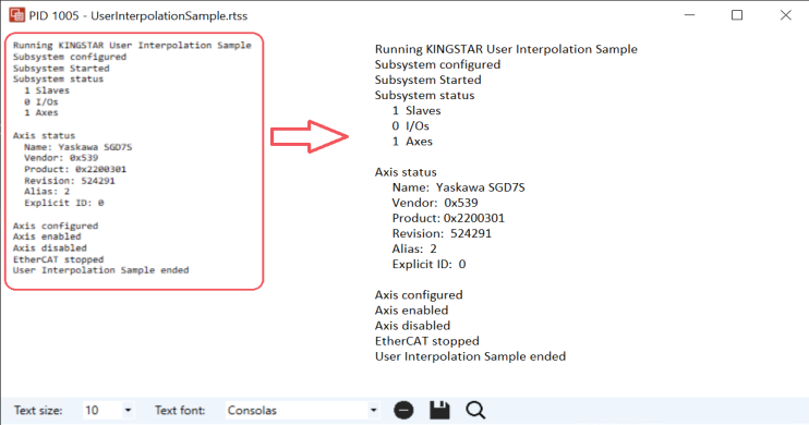 此范例亦介绍了处理 EtherCAT 通讯、配置 EtherCAT 从站和 KINGSTAR 子系统等的 KINGSTAR 现场总线函式,也介绍了配置轴和设定轴位置的 KINGSTAR Motion 函式,但不包含移动函式,若欲使用移动函式,需使用其中一个主插补模式。