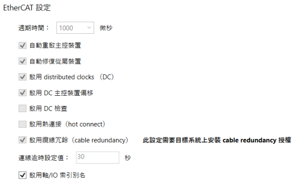 启用 DC 主控装置偏移:决定用来同步在 EtherCAT 网路上的装置之参考时钟,有两种模式:主控装置偏移 (Master Shift) 与总线偏移 (Bus Shift),若勾选,将使用主控装置偏移。