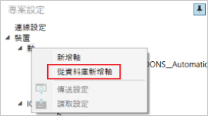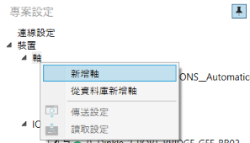 于专案设定上的装置清单右键点击轴或 IO 以显示其右键选单。 新增轴:新增一个模拟轴。 从资料库新增轴:从 KINGSTAR 硬体清单中选择一个轴以加入。 新增 IO:新增一个模拟 I/O 模组。 从资料库新增 IO:从 KINGSTAR 硬体清单中选择一个 I/O 模组以加入。 新增离线轴或 I/O 模组新增离线轴与新增离线 I/O 的方式相同,以下以新增离线轴为例。