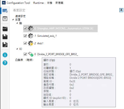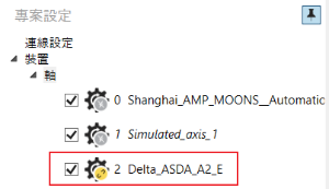 您可于专案设定窗格进行连线设定或对连接的装置进行设定,窗格中会显示连接到的轴、I/O 模组及凸轮表,轴与 I/O 清单仅在连接到实际装置或使用模拟装置时才会显示,装置的相关设定可在连结至装置后进行配置。