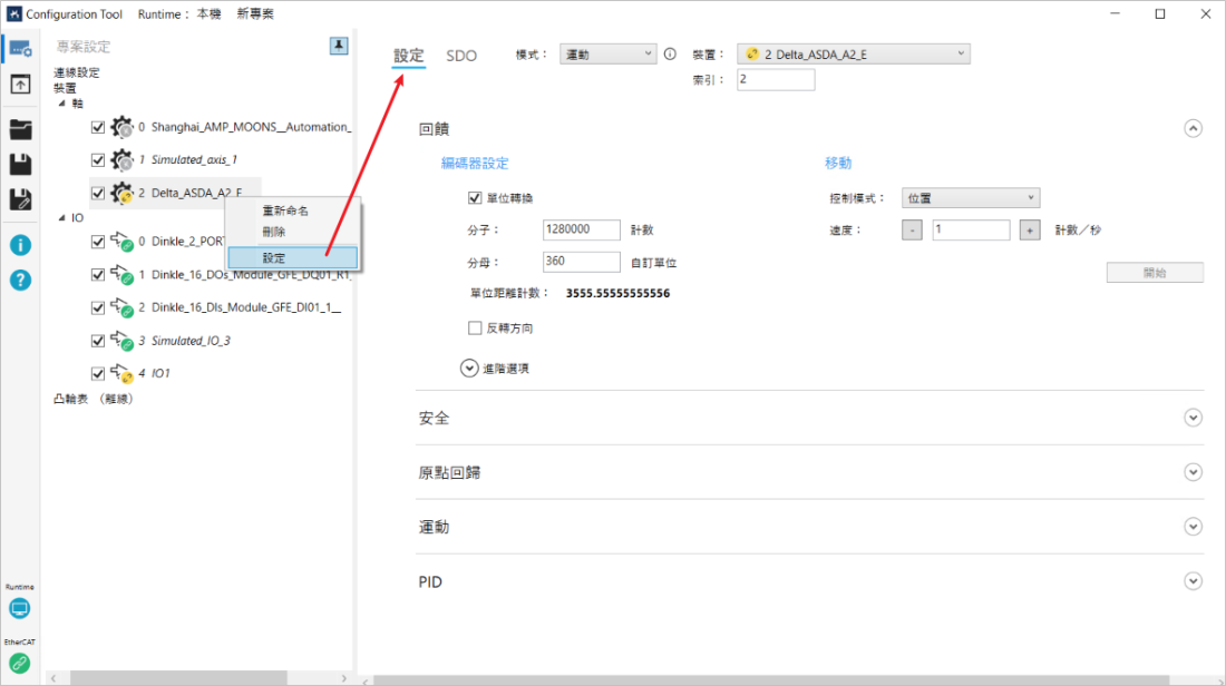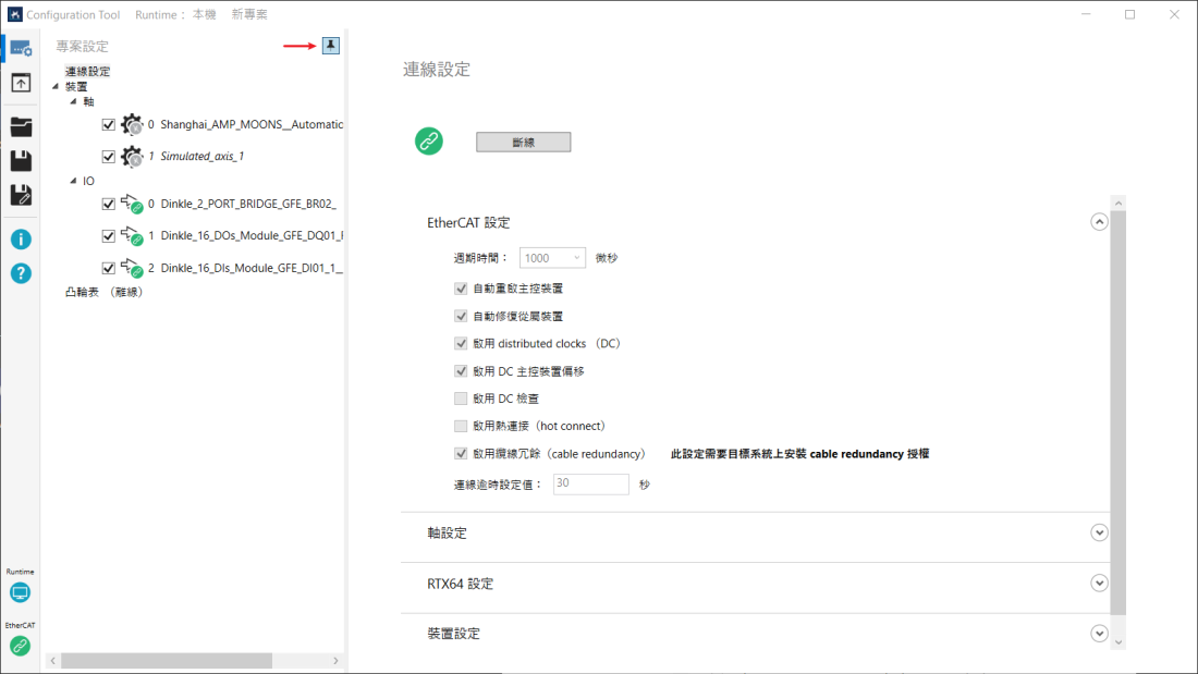专案设定:点击专案设定窗格右上角的图标(红色箭头所指处)可将专案设定窗格钉选/取消钉选/展开/收合。专案设定窗格包含连线设定、装置与凸轮表,点选一个项目,比如装置中的轴,该轴的设定窗格即显示于右方,您可为所选项目进行相关设定。