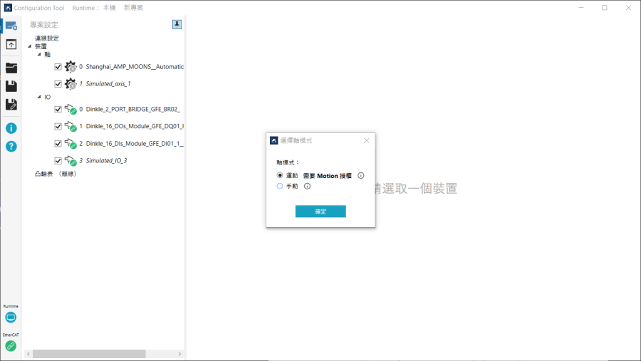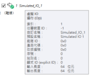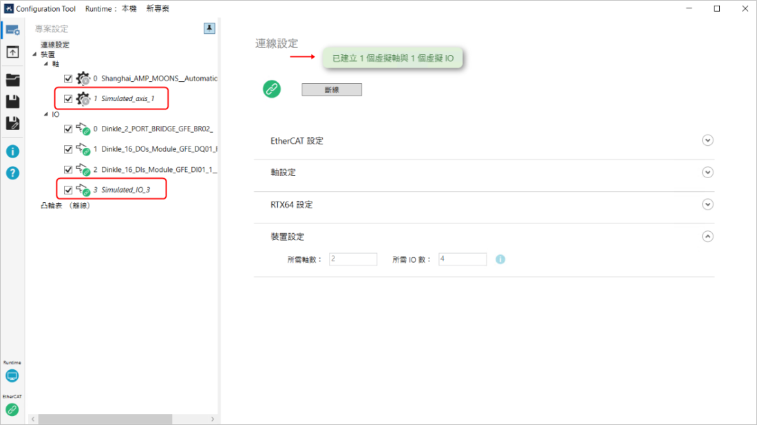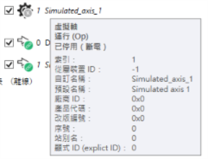 模拟装置建立提示于「连线设定」中建立模拟轴或 I/O 模组时或实际硬体未正确连接时,将会出现提示讯息提醒模拟装置已建立,模拟轴将会以斜体字表示。