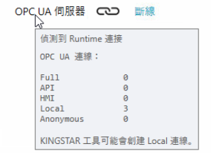 OPC UA 伺服器: 当任何已存在的 OPC UA 连线呼叫 KINGSTAREtherCAT 或 Motion API、存取 PLC 或 KINGSTAR 变数,OPC UA 伺服器 即显示于此。点击「断线」将中断正在使用即时子系统的 OPC UA 用户端(已连结的用户),此包括呼叫 KINGSTAR EtherCAT 或 Motion APIs 的用户及透过 OPC UA 伺服器存取 PLC 或 KINGSTAR 变数的用户端,连接至该电脑 Runtime 的设定工具与示波器的连线亦会被中断。