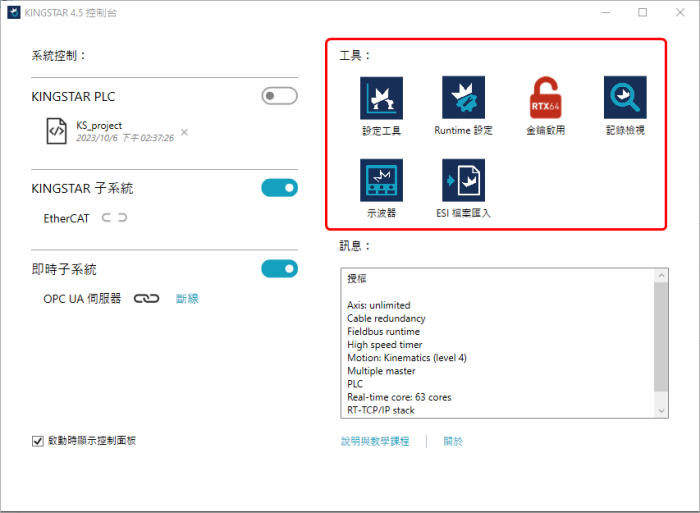 - KINGSTAR PLC: 只在有 KINGSTAR PLC 授权的情况下才会显示 KINGSTAR PLC。您可开启或关闭 KINGSTAR PLC Runtime。当 KINGSTAR PLC 开启时,RTX64 TCP/IP Stack 即启动。更多关于 KINGSTAR PLC 的资讯,请参阅「KINGSTAR PLC」。