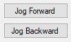 因為不使用點擊行為,因此代碼未寫在 button_Click 方法中,而是使用 MouseDown 事件,當按住滑鼠左鍵時,JogAxis 會用來將軸向前或向後移動;當放開滑鼠鍵時,HaltAxis 則會用來停止寸動,因 MouseDown 套用至 Jog 按鈕,此按鈕的方法為 btnJOG_F_MouseDown、btnJOG_F_MouseUp,、btnJOG_B_MouseDown 和 btnJOG_B_MouseUp,其中 F 為 Jog Forward 而 B 為 Jog Backward,而指令速度從 tbCMD_VEL.Text 接收,並使用 Convert.ToDouble 轉換為雙精準浮點數字。